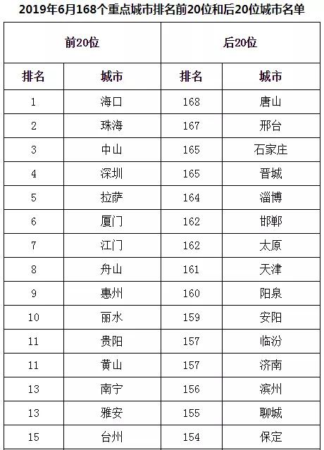 2019年6月,168個(gè)重點(diǎn)城市中唐山、邢臺(tái)、石家莊市等20個(gè)城市空氣質(zhì)量相對(duì)較差(從第168名到第149名);???、珠海、中山市等20個(gè)城市空氣質(zhì)量相對(duì)較好(從第1名到第20名,見附表1)。