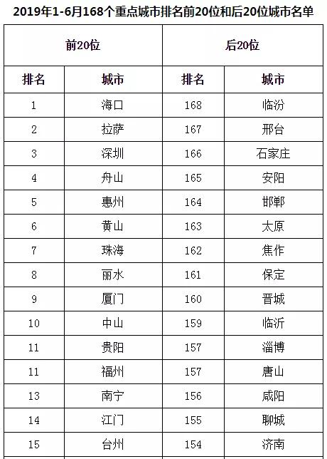 2019年1-6月,168個(gè)重點(diǎn)城市中臨汾、邢臺(tái)、石家莊市等20個(gè)城市空氣質(zhì)量相對(duì)較差(從第168名到第149名);???、拉薩、深圳市等20個(gè)城市空氣質(zhì)量相對(duì)較好(從第1名到第20名,見附表2)。
